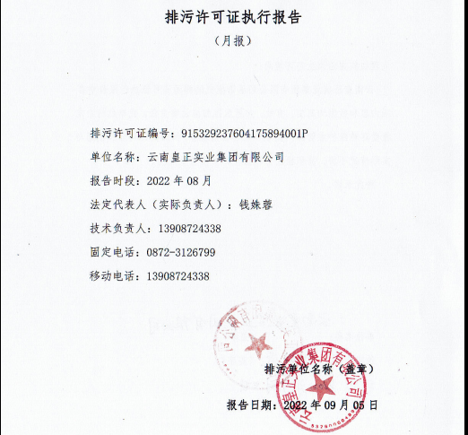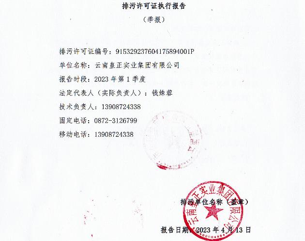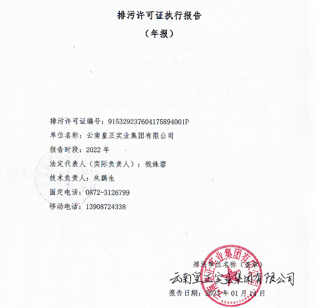 2022年云南皇正實(shí)業(yè)集團(tuán)有限公司排污許可證季報(bào) - 第一季度 2022年云南皇正實(shí)業(yè)集團(tuán)有限公司排污許可證季報(bào)-第一季度