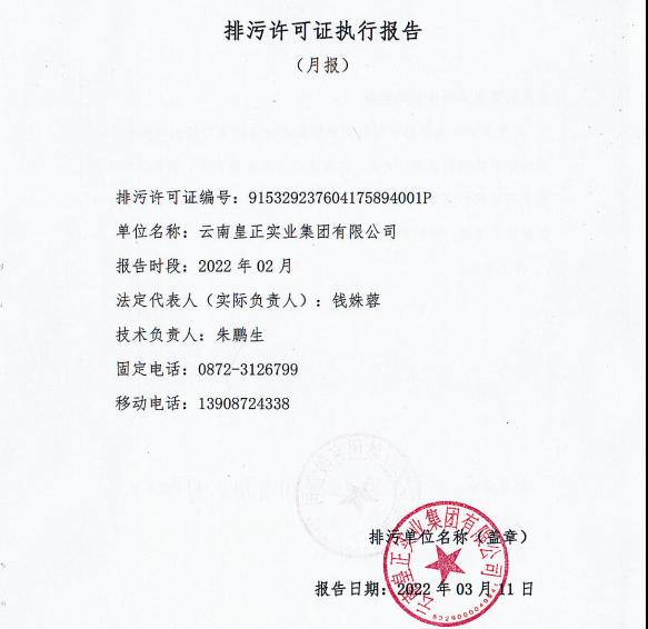 皇正公司2022年2月排污許可證執(zhí)行報(bào)告(月報(bào)) 2022年2月排污許可證執(zhí)行報(bào)告(月報(bào))