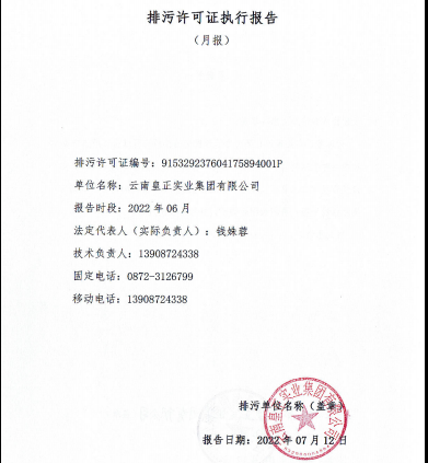 2022年皇正公司排污許可證執(zhí)行報(bào)告6月份月報(bào) 排污許可證執(zhí)行報(bào)告6月份月報(bào)