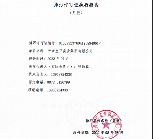 2022年皇正公司排污許可證執(zhí)行報(bào)告7月份月報(bào) 7月排污許可執(zhí)行報(bào)告月報(bào)